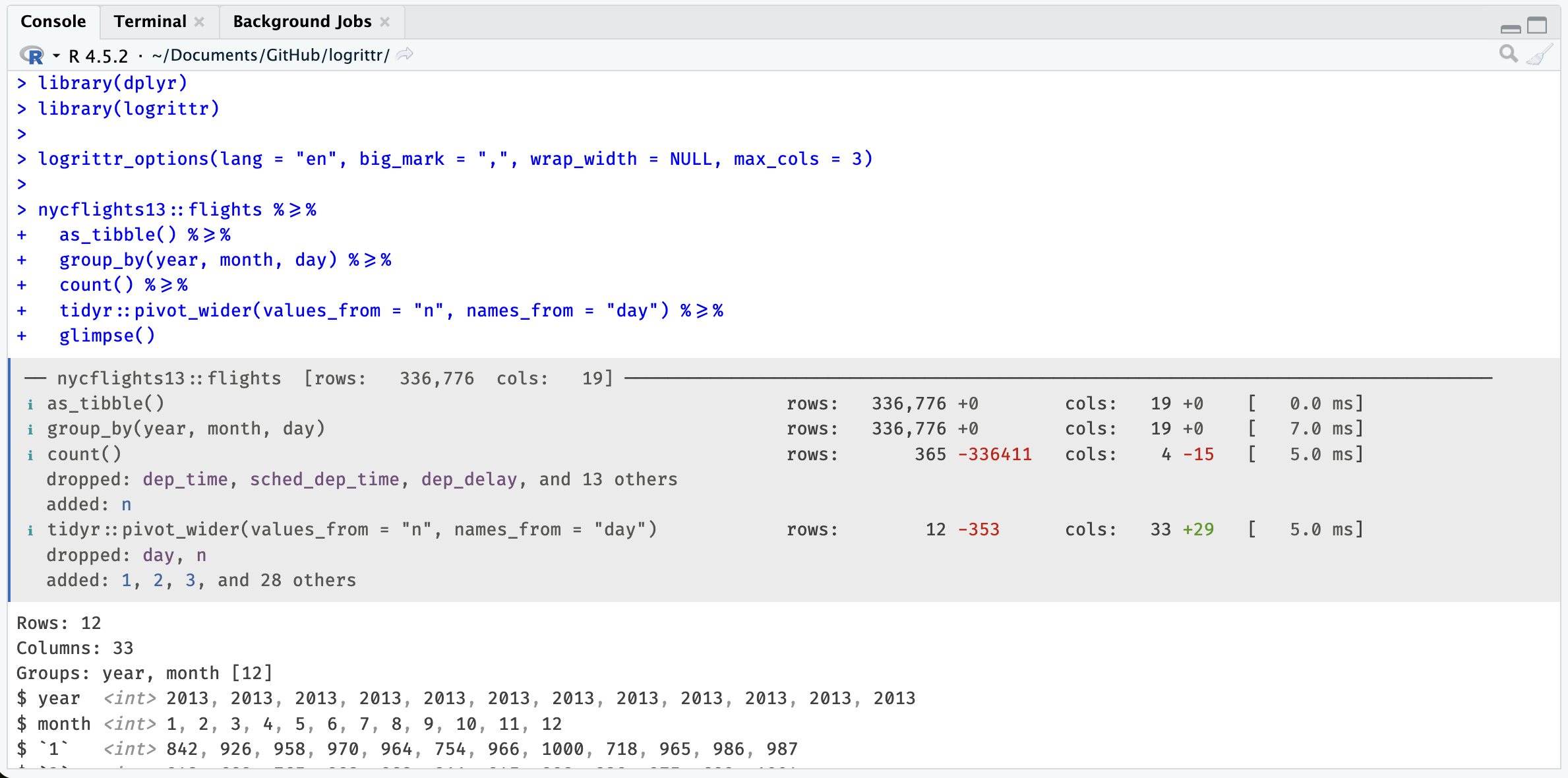 logrittr_options(lang = "en", big_mark = ",", wrap_width = NULL, max_cols = 3)
