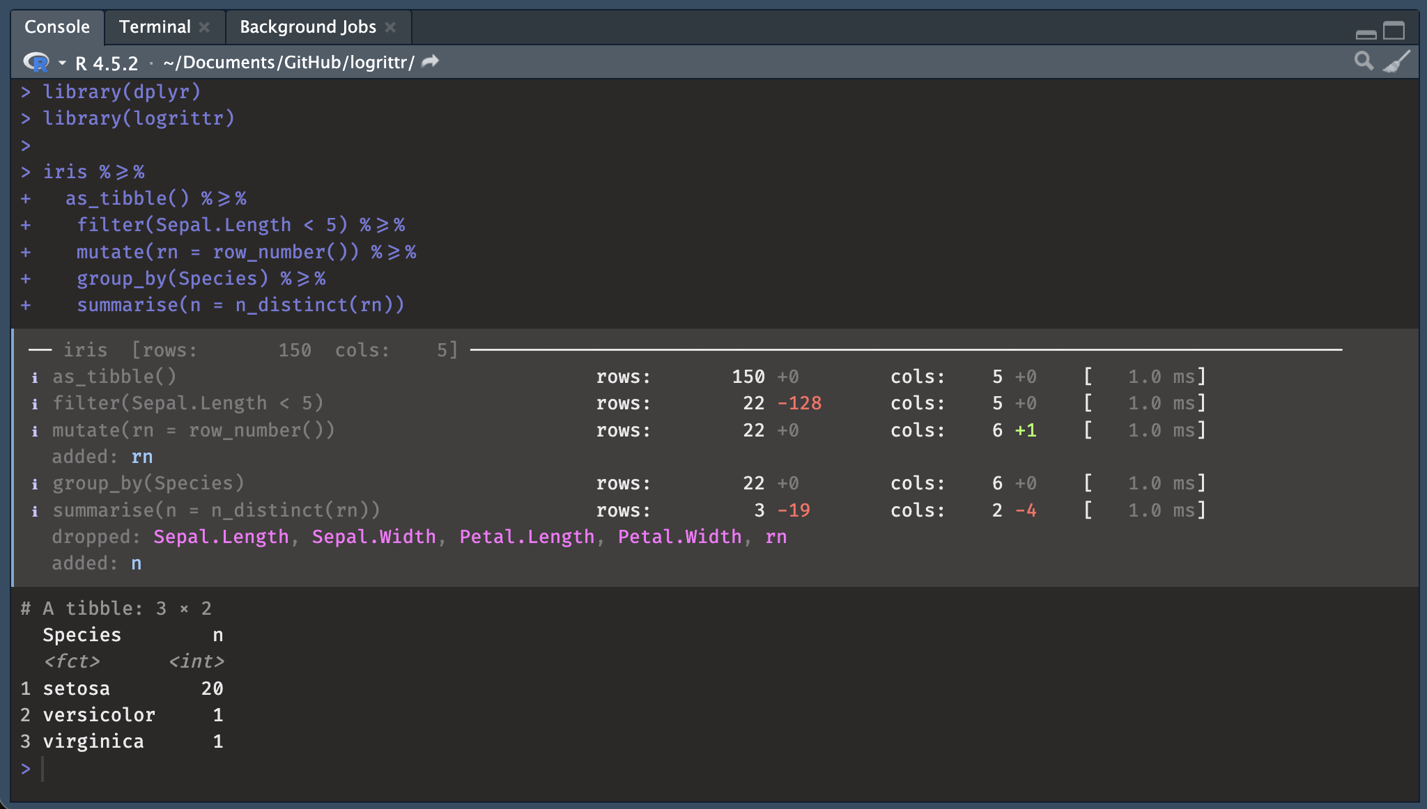 the dplyr namespace. Its console output is colorful and informative thanks to the cli package.